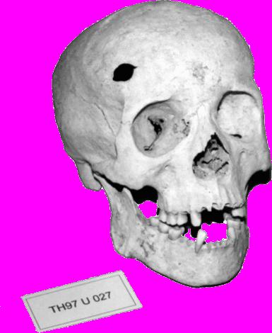 Ce crâne a été découvert lors d'une fouille archéologique à l'extérieur des murailles du château. Par la blessure encore visible, il semble qu'il s'agisse d'un ennemi mort au combat. (XIV° s.)