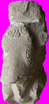 Cette tête sculptée n'est pas une tête de cheval, mais plutôt celle d'un taureau. En effet, on peut voir l'emplacement des cornes. Il s'agissait d'un modillon ("corbeau") soutenant une corniche.
